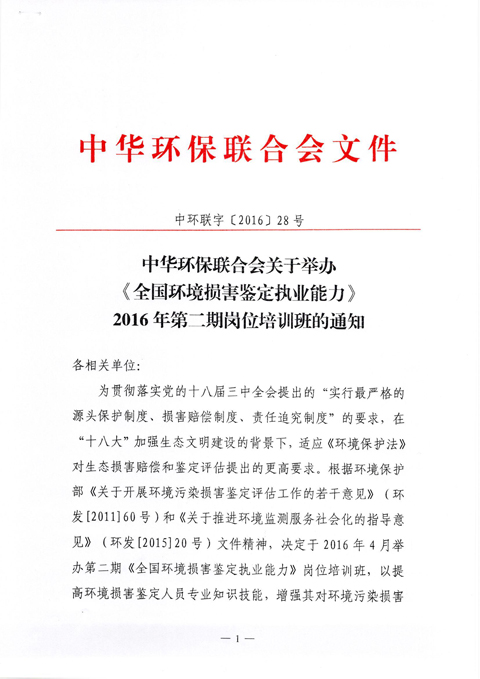 中华环保联合会关于举办《全国环境损害鉴定执业能力》2016年第二期岗位培训班的通知