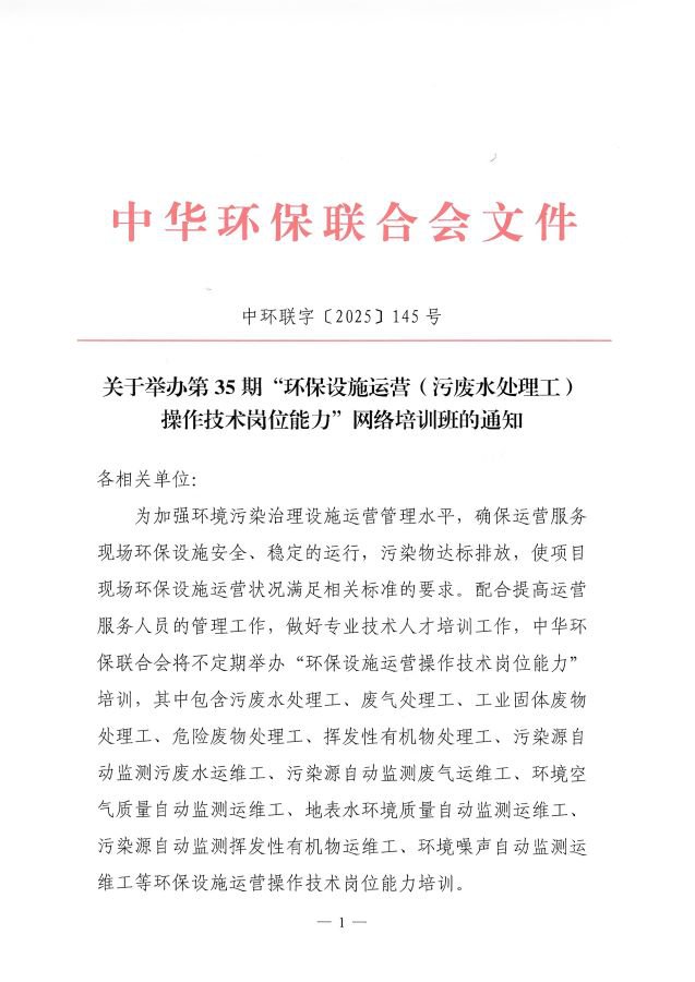 关于举办第35期“环保设施运营(污废水处理工)操作技术岗位能力”网络培训班的通知