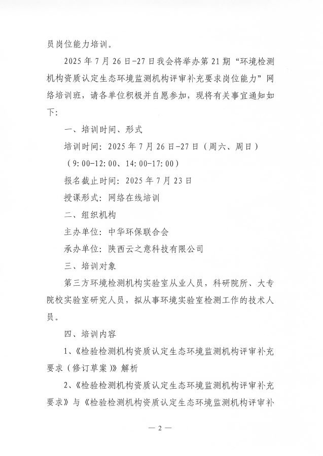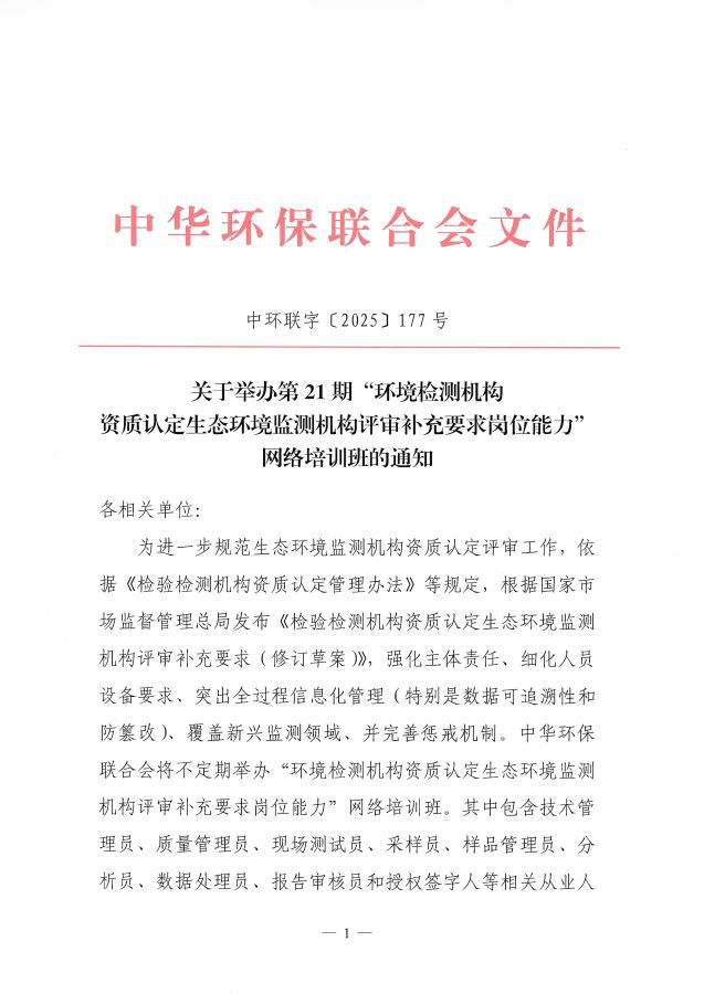 关于举办第21期“环境检测机构资质认定生态环境监测机构评审补充要求岗位能力”网络培训班的通知