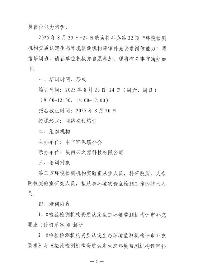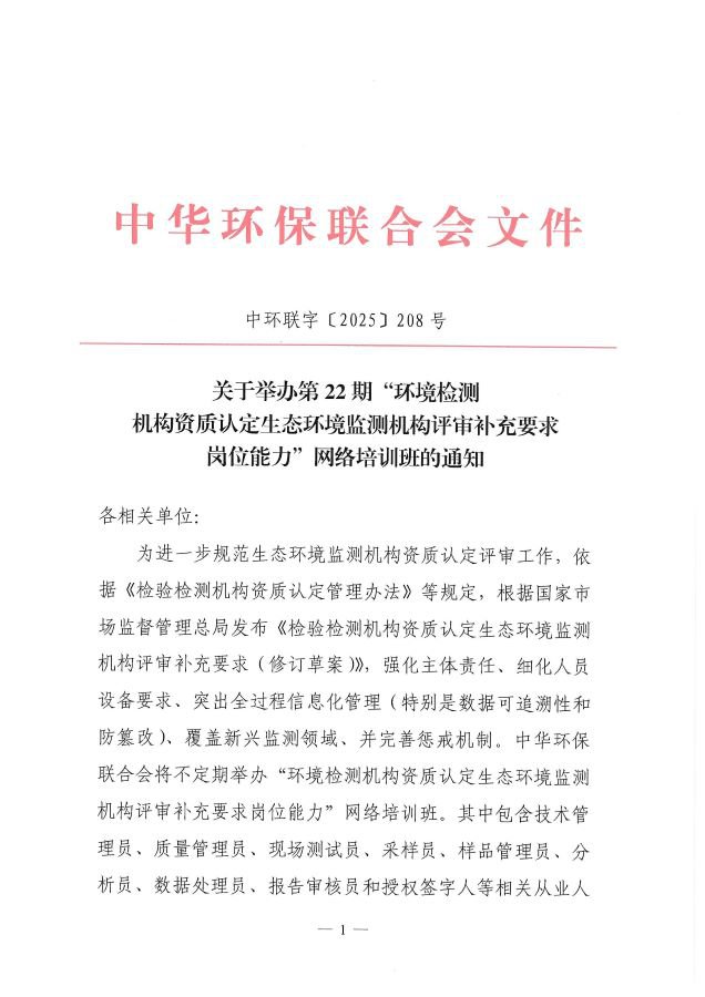 关于举办第22期“环境检测机构资质认定生态环境监测机构评审补充要求岗位能力”网络培训班的通知