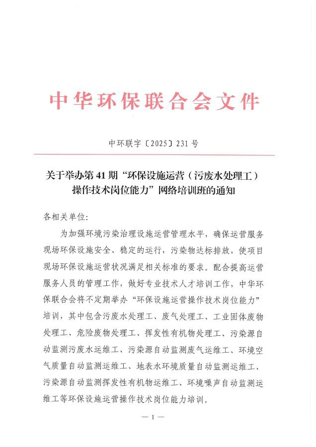 关于举办第41期“环保设施运营(污废水处理工)操作技术岗位能力”网络培训班的通知
