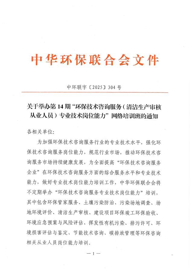 关于举办第14期“环保技术咨询服务(清洁生产审核从业人员)专业技术岗位能力”网络培训班的通知