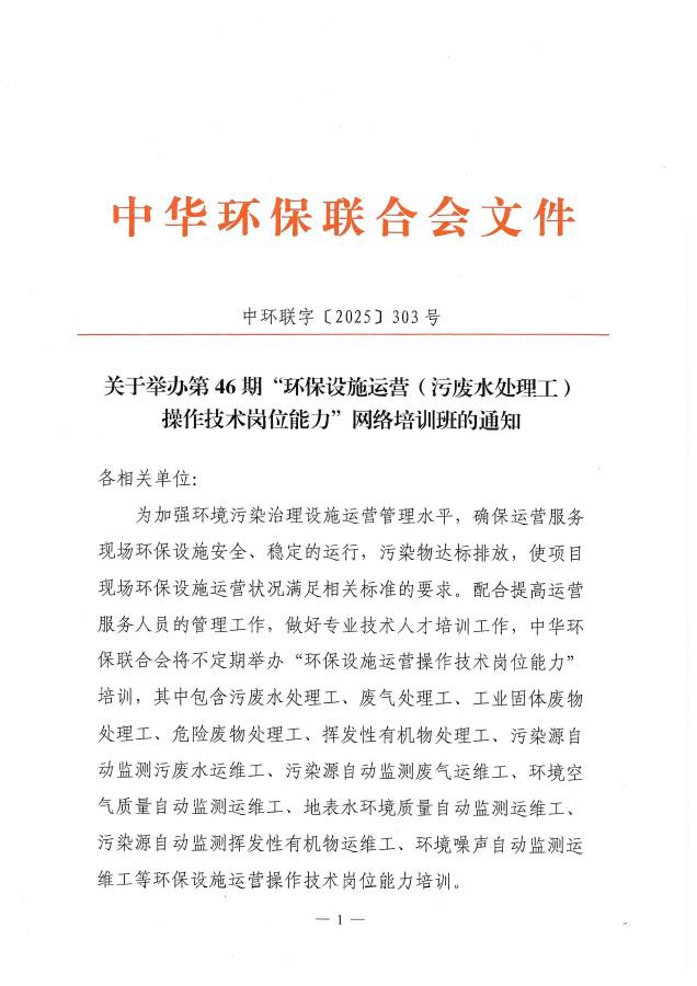 关于举办第46期“环保设施运营(污废水处理工)操作技术岗位能力”网络培训班的通知