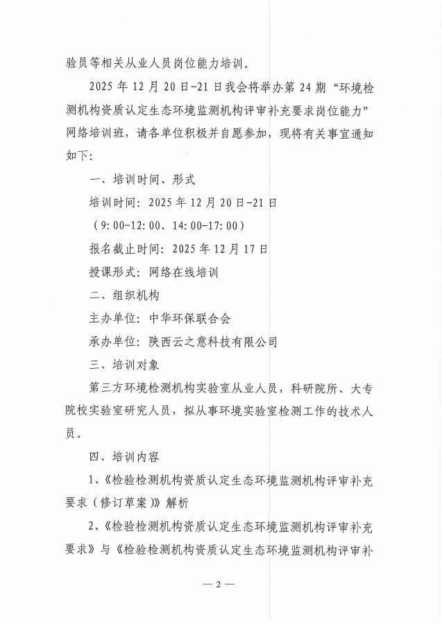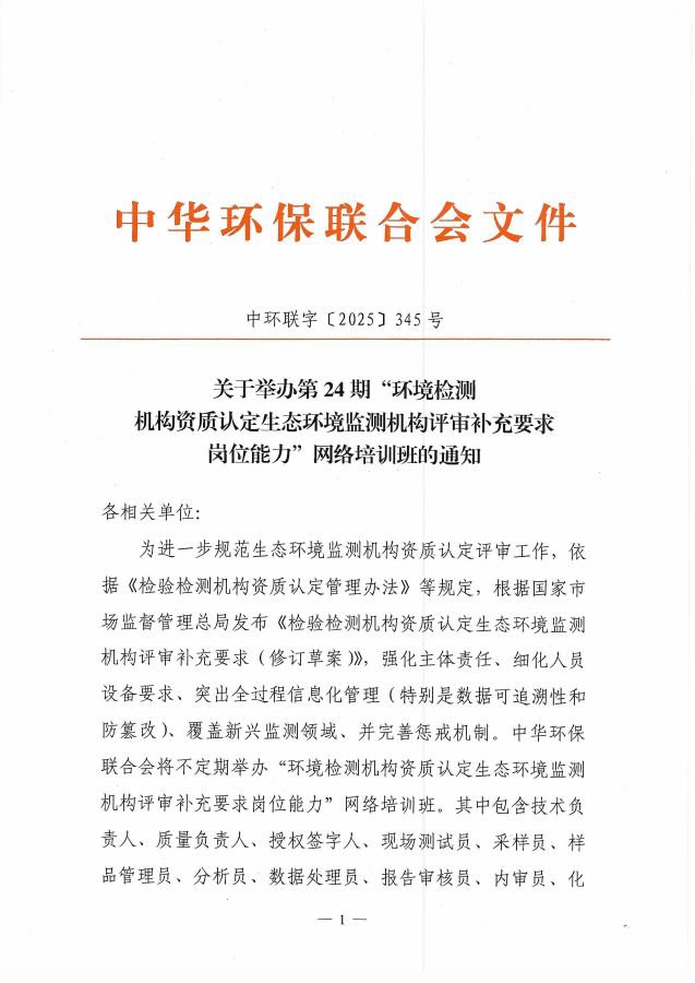 关于举办第24期“环境检测机构资质认定生态环境监测机构评审补充要求岗位能力”网络培训班的通知
