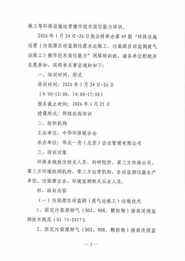 关于举办第49期“环保设施运营(污染源自动监测污废水运维工、污染源自动监测废气运维工)操作技术岗位能力”网络培训班的通知