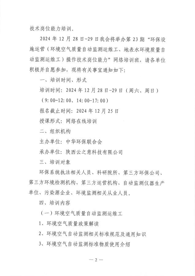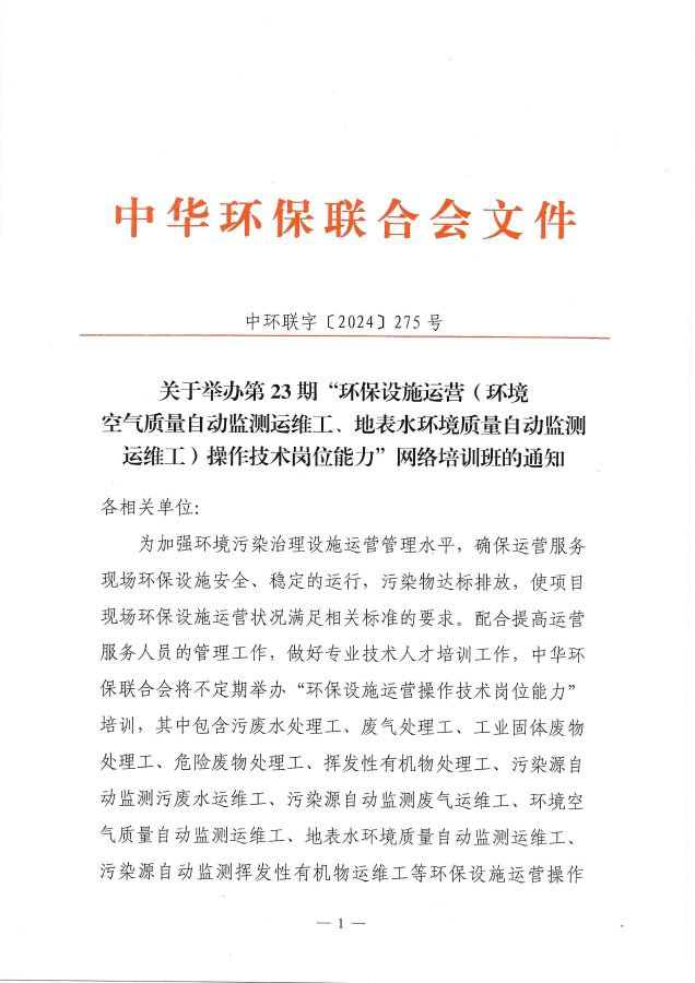 关于举办第23期“环保设施运营(环境空气质量自动监测运维工、地表水环境质量自动监测运维工)操作技术岗位能力”网络培训班的通知