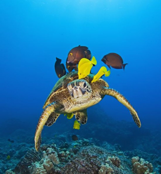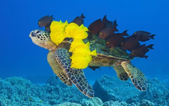 这组照片拍摄于美国夏威夷可纳海岸附近60英尺(18.28 米)深的太平洋海底。居住在可纳的Ushioda先生说,“这个‘海龟清洗站’就像是在提供洗车服务,海龟来到这里,被清洗干净,然后就出去。一有新的没被清洗的海龟来到‘清洗站’,所有的小鱼就放弃之前它们正在清洗的那只,转向新的这只。”来清洗的海龟越脏就越受欢迎。在一个小时的潜水过程中,前后约有十几只海龟享受“洗车”服务。清洗完毕,小鱼离开后,很多海龟选择在附近的暗礁上睡上20分钟,有的海龟则立刻离开。
