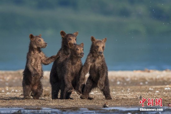 当地时间2015年1月28日报道,俄罗斯千岛湖,53岁的摄影师Sergey Ivanov拍摄到四头熊宝宝在岸边观看爸爸奋力捕鱼的场景,样子非常有爱。图片来源:东方IC 版权作品 请勿转载