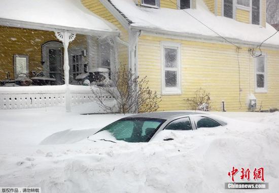 当地时间1月28日,马萨诸塞州的赫尔小城,一辆汽车被埋在雪中。
